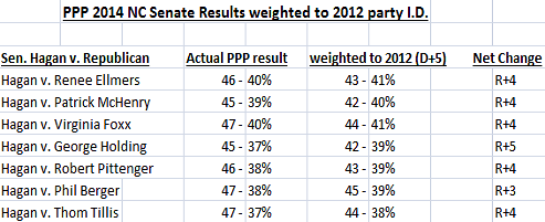 As you can see, naturally, the numbers decline for Democrats as their numbers in the electorate decline. For example, Barack Obama's 46/52% job approval/disapproval rating becomes 44/55% when shifting PPP's party I.D. from D+12 to D+5. For the record, the shift in party ID has less disastrous consequences for Sen. Kay Hagan when matched against her likely GOP opponents. Even when reweighting the PPP poll from D+12 to 2012's Governor turnout, Hagan's closest competitor still trails by 2 points, 43-41%: